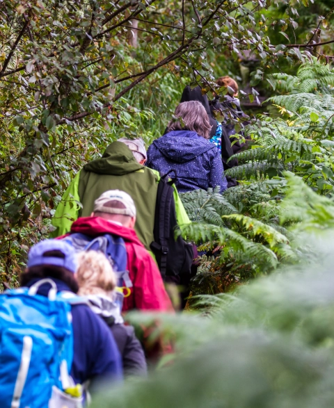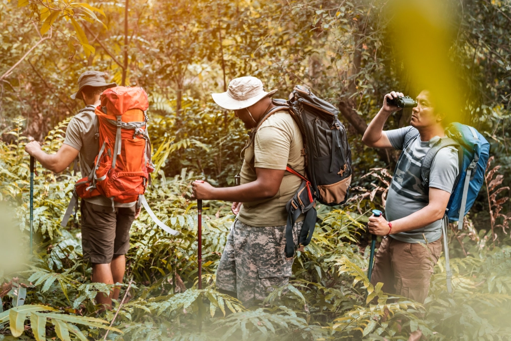 Wear sturdy hiking boots, long trousers, long-sleeved shirts, and gloves. Neutral colors, rain jackets, and gaiters are also recommended for comfort in the forest.